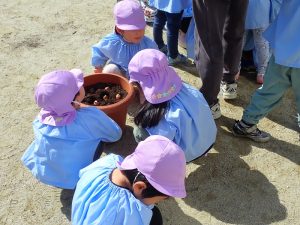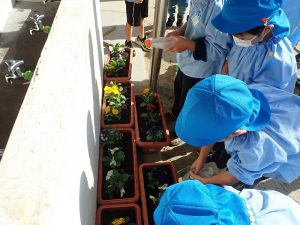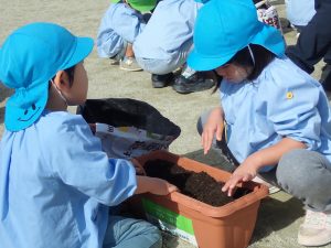 年長組は、今から卒園まで楽しめる「パンジー」を、年中・年少組は、今から育てて春先の進級時に花が開く「チューリップ」を植えさせていただきました。
