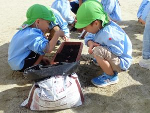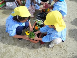 年長組は、今から卒園まで楽しめる「パンジー」を、年中・年少組は、今から育てて春先の進級時に花が開く「チューリップ」を植えさせていただきました。