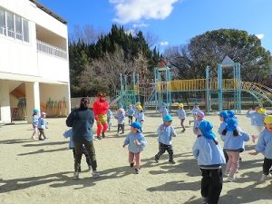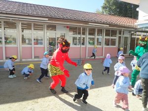 「豆まき」をしている間は、ぶどう組(満三歳児クラス)さんは室内遊びをしていました。これも、怖がらせることになっては意味がないので、年少組になったときのお楽しみです。