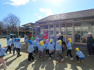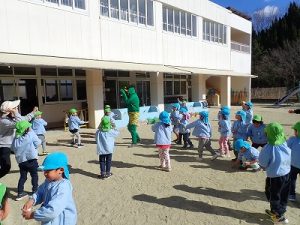 「豆まき」をしている間は、ぶどう組(満三歳児クラス)さんは室内遊びをしていました。これも、怖がらせることになっては意味がないので、年少組になったときのお楽しみです。