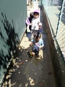 そんな中、「水あそび」が大好きな子どもたちが、園庭にたまった水たまりの中で遊んでいました。