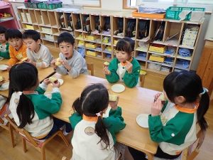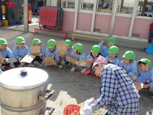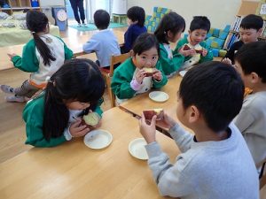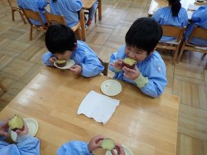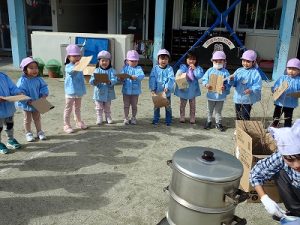 できあがった「ふかしいも」は、年長組の皆にもおすそ分けしました。