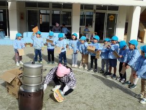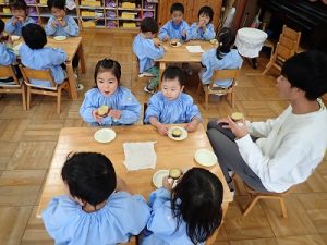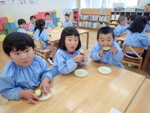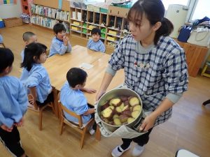 できあがった「ふかしいも」は、年長組の皆にもおすそ分けしました。