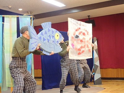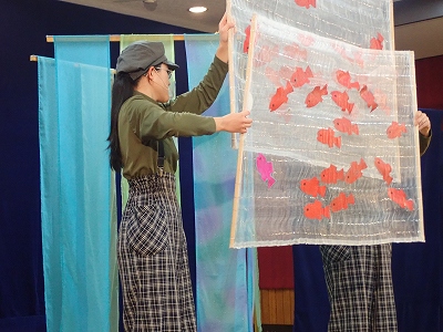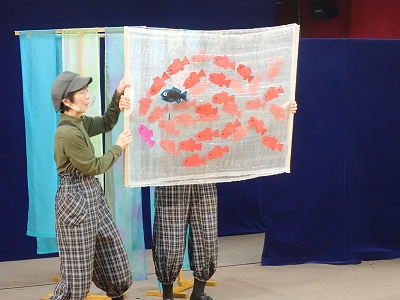 子どもたち全員、絵本で馴染みのある話でした。劇中、日本語が全く使われないまま、スイミーが「ピー」とか「ウィー」などの擬音のみで構成されていて、「むすび座」さんのプロの技を見せられた感じがします。