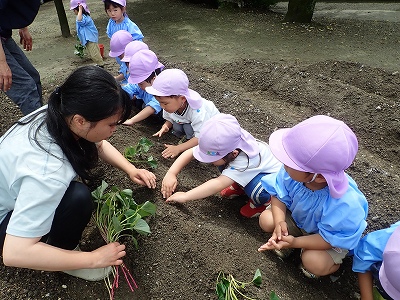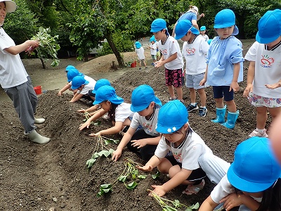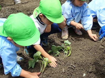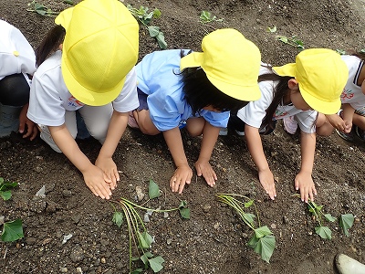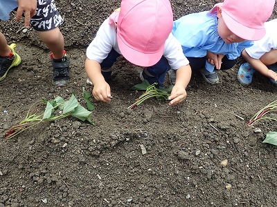 今日は全園児で幼稚園となりにある、畑でさつまいものつるさしをしました。