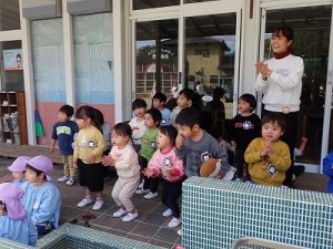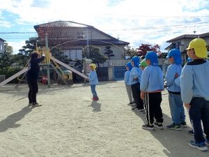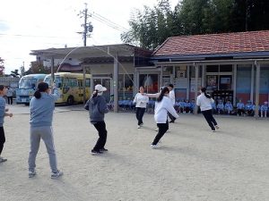 まずは、先生たちが一人跳びや長縄跳びを見せました。見ている子どもたちも、応援する子・一緒に跳んでまねている子…・